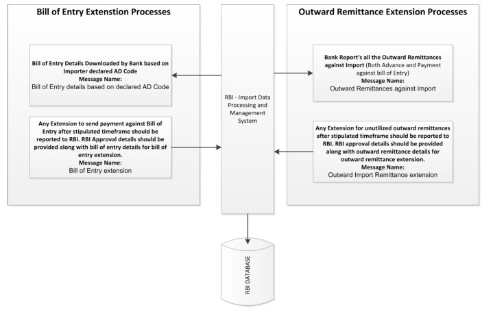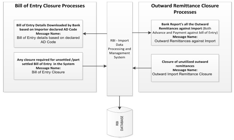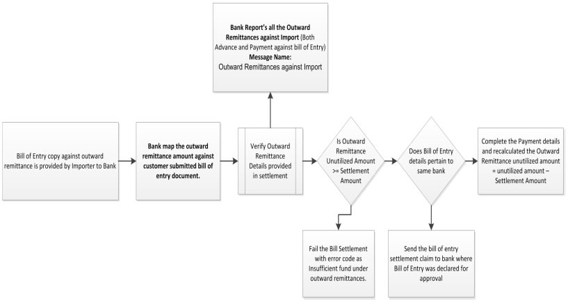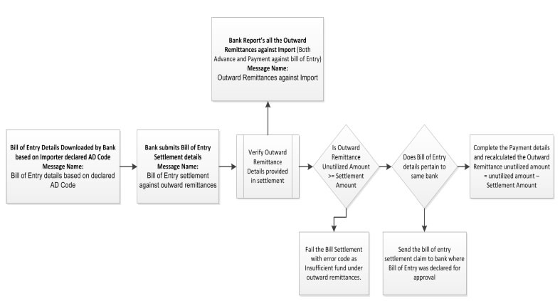 1.1.10 Bill of Entry settlement against outward remittances Bank needs to report the bill of entry settlement against pre uploaded outward remittances, bank can report bill of entry pertaining to any bank where outward remittances is done though the bank, however system will have additional process of approval for the cases where in the owner bank for Bill of Entry is different from owner bank of Outward Remittances. Onus of Outward Remittances settlement lies with the bank form where Outward Remittances is effected against bill of entry by Importer. Following fields are identified for Bill of Entry Settlement Reporting | Sr. No. | Field Description | Field Type | Field Length | | 1 | Port of Discharge | C | | | 2 | Bill of Entry Number | C | | | 3 | Bill of Entry Date | Date | | | 4 | IE Code | C | | | 5 | AD Code | C | | | 6 | Record Indicator | C | | | 7 | Payment Party (Buyer (B)/Third Party (T)) | C | | | 8 | Payment Reference Number | C | | | 9 | Invoice Serial No | C | | | 10 | Actual Invoice No | C | | | 11 | ORM Number | C | | | 12 | ORM AD Code | C | | | 13 | Equivalent Amount in Invoice Currency (Invoice Value) | N | | | 14 | Remitted Amount in ORM Currency (Invoice Value) | N | | | 15 | Equivalent Amount in Invoice Currency (Freight Value) | N | | | 16 | Remitted Amount in ORM Currency (Freight Value) | N | | | 17 | Equivalent Amount in Invoice Currency (Insurance Value) | N | | | 18 | Remitted Amount in ORM Currency (Insurance Value) | N | | | 19 | Closing of BOE ( open -1/close-2) | | | Each payment will be validated against unutilized amount available under Outward Remittance, Outward Remittance will be identified uniquely based on ORM Number and ORM AD Code. Reported settlement will fail if ORM details are not matching or the unutilized amount is less than the settlement amount. 1.1.11 Bill of Entry Transfer Request System will provide option to the banks to transfer BOE from declared bank to submitted bank.Following fields are identified for this message type | Sr. No. | Field Description | Field Type | Field Length | | 1 | Port of Discharge | C | | | 2 | Bill of Entry Number | C | | | 3 | Bill of Entry Date | Date | | | 4 | Import Agency | C | | | 5 | IE Code | C | | | 6 | Existing AD Code | C | | | 7 | Changed AD Code | C | | 1.1.12 Bill of Entry Transfer Approval System will provide option to the banks to approve the transfer of BOE from declared bank to submitted bank. Declared Bank can Approve / Reject the transfer requested from submitted bank.Following fields are identified for this message type | Sr. No. | Field Description | Field Type | Field Length | | 1 | Port of Discharge | C | | | 2 | Bill of Entry Number | C | | | 3 | Bill of Entry Date | Date | | | 4 | Import Agency | C | | | 5 | IE Code | C | | | 6 | Existing AD Code | C | | | 7 | Changed AD Code | C | | | 8 | Status | C | | | 9 | Remarks | C | | 1.1.13 ORM payment mapping approval against bill of entry reported by other bank System will provide option to Bill of Entry owner bank to report approval/rejection of BOE settlement claim by other bank against the outward remittance send through them.Based on the approval and rejection the actual outward remittance utilization will be calculated against bill of entry and closed.If bank rejects the BOE settlement, the claimed amount in settlement will be reduced from utilized amount and will be added to unutilized amount for tracking the outward remittances. Following fields are identified for approval reporting | Sr. No. | Field Description | Field Type | Field Length | | 1 | Port of Discharge | C | | | 2 | Bill of Entry Number | C | | | 3 | Bill of Entry Date | Date | | | 4 | IE Code | C | | | 5 | AD Code | C | | | 6 | Record Indicator | C | | | 7 | Payment Party (Buyer (B)/Third Party (T)) | C | | | 8 | Payment Reference Number | C | | | 9 | Invoice Serial No | C | | | 10 | Actual Invoice No | C | | | 11 | ORM Number | C | | | 12 | ORM AD Code | C | | | 13 | Equivalent Amount in Invoice Currency (Invoice Value) | N | | | 14 | Remitted Amount in ORM Currency (Invoice Value) | N | | | 15 | Equivalent Amount in Invoice Currency (Freight Value) | N | | | 16 | Remitted Amount in ORM Currency (Freight Value) | N | | | 17 | Equivalent Amount in Invoice Currency (Insurance Value) | N | | | 18 | Remitted Amount in ORM Currency (Insurance Value) | N | | | 19 | Status | C | | | 20 | Remarks | C | | 1.1.14 Outward Import Remittance extension Outward import remittance extenstion message is designed for the bank to report the extenstions received by RBI on the outward remittance post stipulated timeline. Following are the fields identified for this process | Sr. No. | Field Description | Field Type | Field Length | | 1 | Outward Reference Number | C | | | 2 | AD Code | C | | | 3 | Amount | N | | | 4 | Currency | C | | | 5 | Payment Date | Date | | | 6 | IE Code | C | | | 7 | SWIFT | C | | | 8 | Record Indicator | C | | | 9 | Approved by (RBI/Bank) | | | | 10 | Letter Number | C | | | 11 | Letter Date | Date | | TBD: Do we need to restrict the BOE settlement if the stipulated timeframe for outward remittance is completed/crossed. 1.1.15 Bill of Entry Extension System will provide option to bank wherein they can report any extenstion provided by RBI on late payment against bill of entry. Following fields are identified for reporting Bill of Entry Extension | Sr. No. | Field Description | Field Type | Field Length | | 1 | Port of Discharge | C | | | 2 | Import Agency | C | | | 3 | Bill of Entry Number | Date | | | 4 | Bill of Entry Date | C | | | 5 | IE Code | C | | | 6 | AD Code | C | | | 7 | Record Indicator | C | | | 8 | Approval given by | | | | 9 | Letter Number | C | | | 10 | Letter Date | C | | TBD: Do we need to restrict the BOE settlement if the stipulated timeframe for BOE Settlement is completed/crossed. 1.1.16 Outward Import Remittance Closure System will provide option for the banks for closure of outward import remittance amount in part / full under pre-defined 