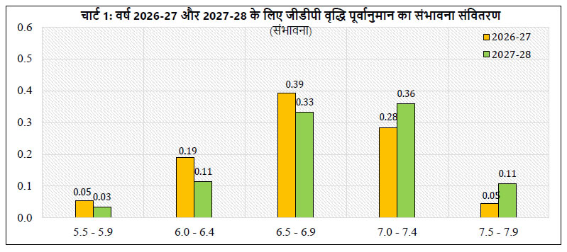 पूर्वानुमानकर्ताओं ने वास्तविक जीडीपी वृद्धि की उच्चतम संभावना 2026-27 के लिए 6.5–6.9 प्रतिशत की सीमा और 2027-28 के लिए 7.0-7.4 प्रतिशत की सीमा में बताई है (चार्ट 1)।