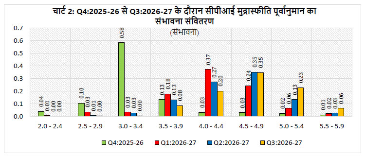 हेडलाइन सीपीआई मुद्रास्फीति (वर्ष-दर-वर्ष) 2025-26 की चौथी तिमाही के दौरान 3.1 प्रतिशत रहने की उम्मीद है। इसके बाद, 2026-27 की पहली तिमाही के दौरान 4.1 प्रतिशत से धीरे-धीरे बढ़कर तीसरी तिमाही में 4.7 प्रतिशत तक पहुँचने की उम्मीद है और फिर चौथी तिमाही:2026-27 के दौरान 4.2 प्रतिशत पर स्थिर होने की उम्मीद है (सारणी 3)।